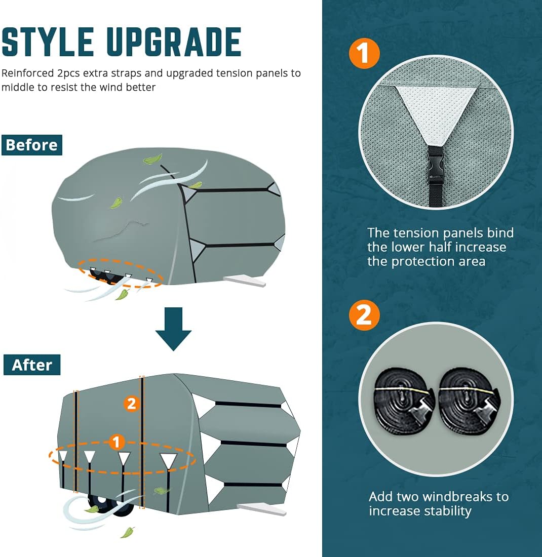 - ✅【A prueba de viento】El cambio de posición de los paneles de tensión media en el lateral aumenta eficazmente la zona de tensión y proporciona 2 correas adicionales para atar el cuerpo de tu caravana. Lideramos el diseño resistente al viento del panel de tensión y las correas resistentes al viento, y creemos que nuestro espíritu innovador y profesionalismo para las cubiertas de RV no se puede imitar